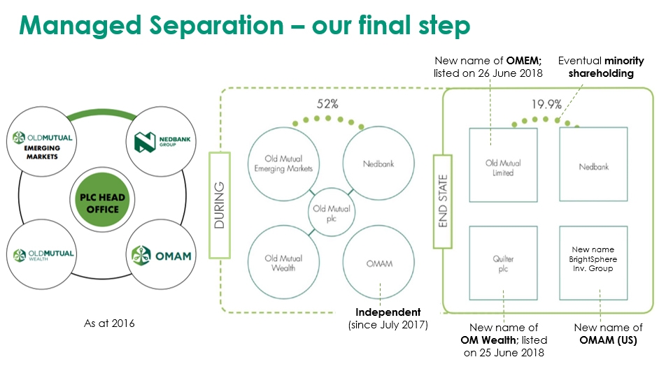 As part of the Managed Separation process, Old Mutual is separating its four businesses with an aim to unlock shareholder value. The businesses are Old Mutual Limited (previously called Old Mutual Emerging Markets), Nedbank, Quilter plc (previously called Old Mutual Wealth UK), and BrightSphere Investment Group (previously called OMAM in the US).